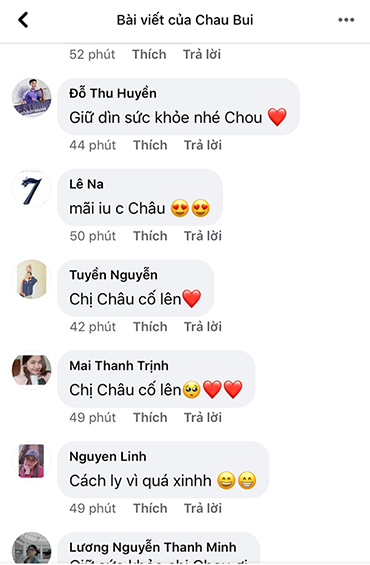 Bên cạnh đó, Châu Bùi cũng không quên dặn dò, nhắn nhủ đến fan của mình: "#teamchouchou ở nhà chủ động bảo vệ và tiếp sức cho Châu nhé! Châu sẽ cập nhật tình hình liên tục và sớm trở lại thôi".