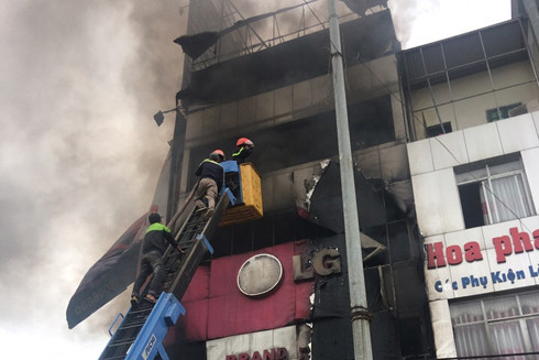 Lực lượng cứu hỏa dùng xe thang tiến cập tòa nhà để cứu nạn, cứu hộ