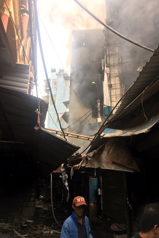 Trước diễn biến phúc tạp, ngọn lửa có nguy cơ cháy lan sang 3 nhà lân cận, đặc biệt là khu chợ Xuân Mai có nguy cơ bắt lửa rất cao, chỉ huy chữa cháy đã cho mũi công tăng cường vòi rồng chặn luồng lửa.