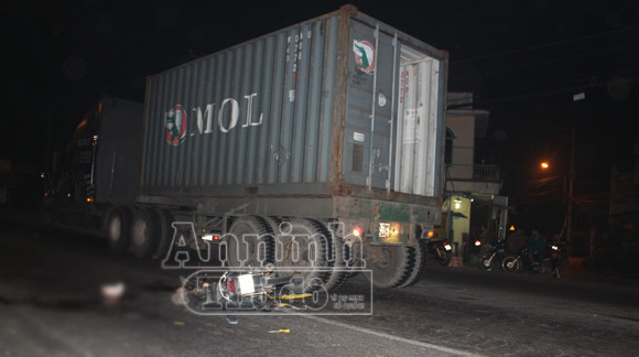Do chạy nhanh, không xử lý kịp, đôi thanh niên đã để xe máy tông thẳng vào đuôi bên trái xe container.