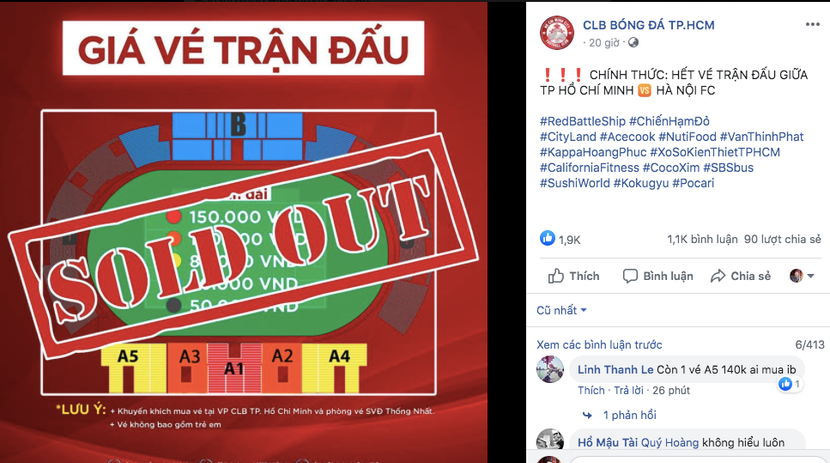 Và cho tới tối 22-7, tức hai ngày trước giờ bóng lăn, trang facebook chính thức của CLB TP.HCM thông báo toàn bộ vé trận đấu đã được bán hết.