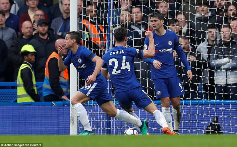Azpilicueta (trái) mở tỉ số cho đội chủ nhà
