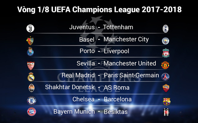 Kết quả 8 cặp đấu như sau: Juventus vs Tottenham, Basel vs Man City, Porto vs Liverpool, Sevilla vs M.U, Real Madrid vs PSG, Shakhtar vs Roma, Chelsea vs Barca, Bayern vs Besiktas.