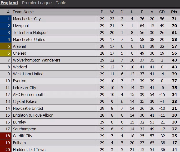 Bảng xếp hạng Ngoại hạng Anh sau vòng 29