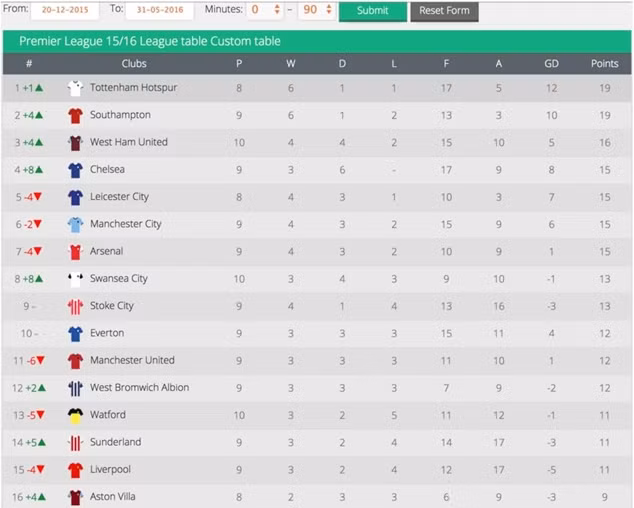 Nếu chỉ tính kết quả của Chelsea kể từ lúc Hiddink thay thế Mourinho, The Blues sẽ đứng thứ 4 trên bảng xếp hạng Premier League, phía sau Tottenham, Southampton và West Ham.