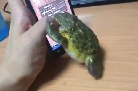 Người đàn ông đưa ngón tay cái chạm vào màn hình nhưng đã bất ngờ bị con ếch tấn công khiến anh ta phải hét lên đau đớn.