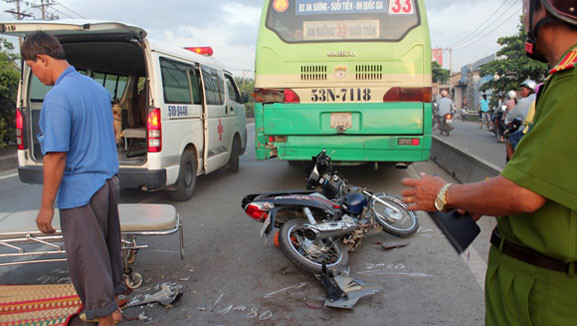 Tại hiện trường, xe máy của nạn nhân bị hư hỏng nặng, chiếc xe buýt bị bể nát phần đuôi bên trái. Cả hai phương tiện nằm trên làn đường xe ô tô đã gây cản trở giao thông qua khu vực.