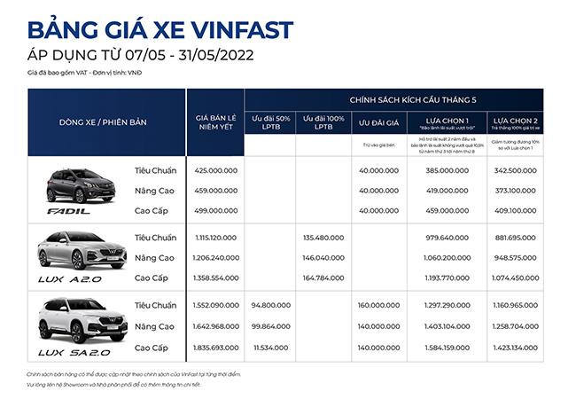 Tương tự, dòng xe Lux A2.0 cũng đang được VinFast áp dụng các chương trình ưu đãi riêng. Khách mua xe trong tháng 5/2022 sẽ nhận được ưu đãi 100% lệ phí trước bạ, đồng thời giảm 10% giá xe khi trả thẳng hoặc miễn lãi suất trả góp trong 2 năm. Nhờ đó, mẫu Lux A2.0 phiên bản Cao cấp đang có giá bán lẻ cuối cùng là 1,074 tỷ đồng.