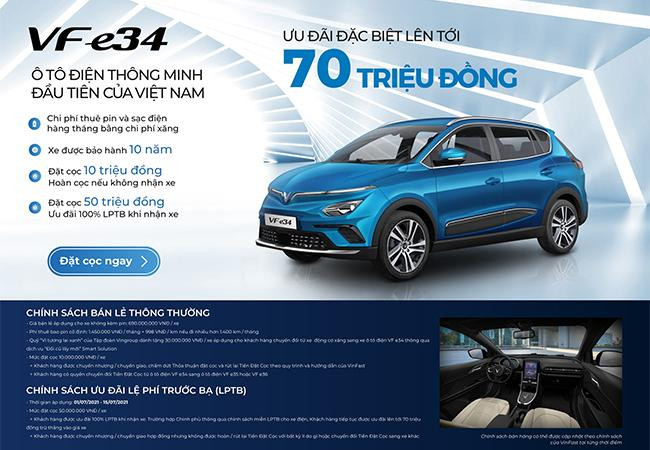 Thông tin về chính sách mới cho khách hàng đặt cọc ô tô điện VF e34 của VinFast đang làm “nóng” cả thị trường. Cụ thể, để tạo cơ hội cho người Việt dễ dàng tiếp cận dòng xe VF e34, từ nay đến 15/7/2021, tất cả khách hàng đặt cọc trước 50 triệu đồng sẽ được hưởng ưu đãi 100% lệ phí trước bạ, tương đương 70 triệu đồng.