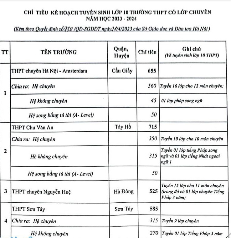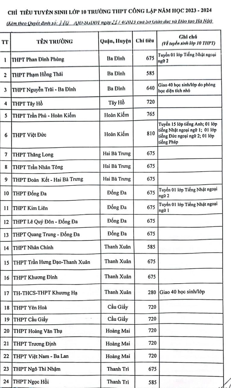 Ngày 22-4, Sở GD-ĐT Hà Nội đã công bố chỉ tiêu tuyển sinh vào lớp 10 các trường THPT công lập năm 2023.