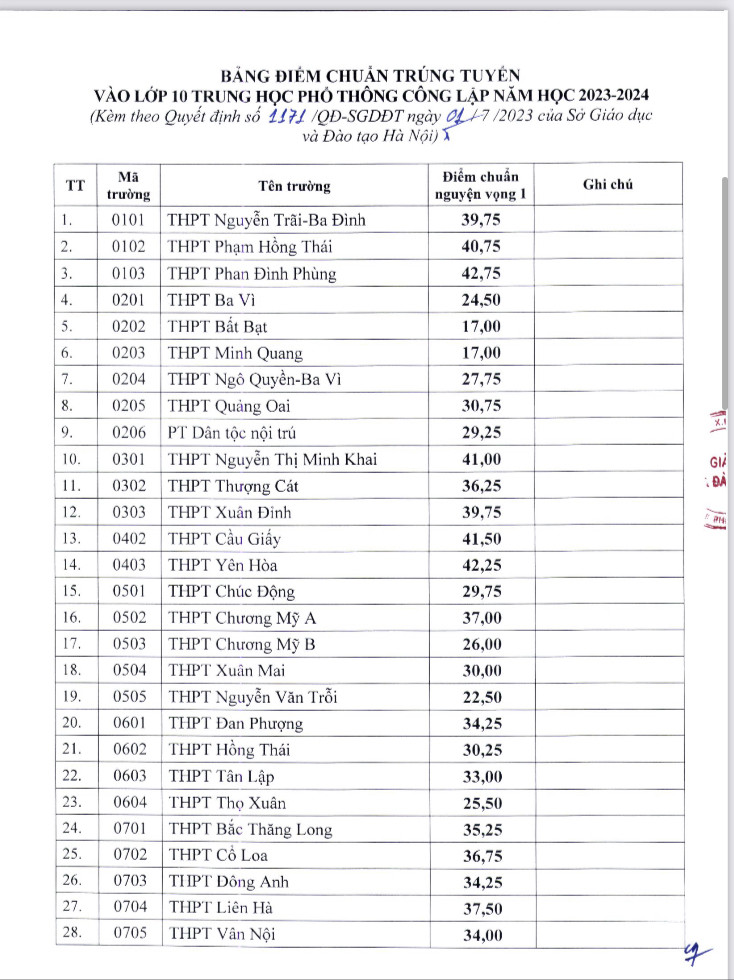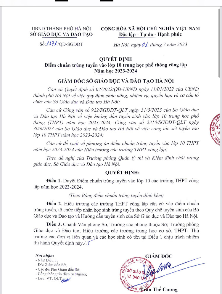 | Hà Nội công bố điểm chuẩn lớp 10 công lập năm học 20233-2024 |