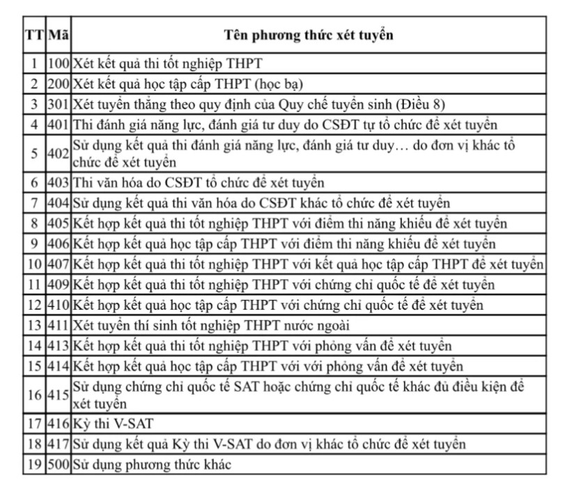 Bộ GD-ĐT cũng đưa ra 19 mã phương thức xét tuyển năm 2025 như sau: