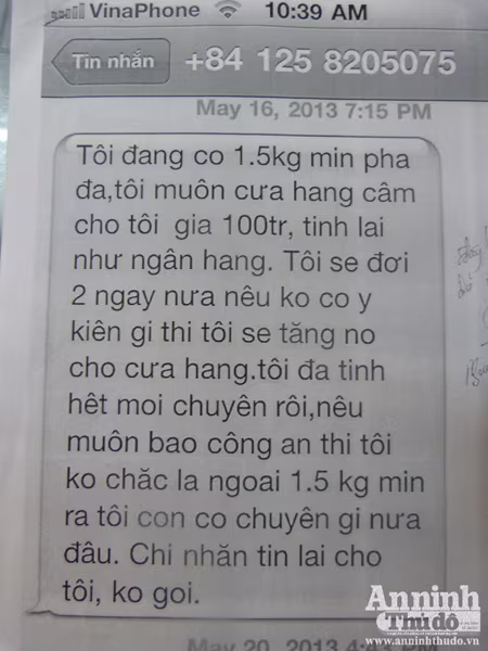 Như An ninh Thủ đô đã đưa tin, Cơ quan CSĐT – CAQ Hà Đông, thành phố Hà Nội vừa khởi tố vụ án, khởi tố bị can và ra lệnh tạm giam đối với Nguyễn Xuân Thiệu (SN 1991), trú tại Quang Trung, Kiến Xương, Thái Bình về hành vi cưỡng đoạt tài sản. Trước đó, vào ngày 22-5, CAH Hà Đông nhận được đơn trình báo của chị Nguyễn Thị Thu H (chủ một hiệu vàng nằm trên địa bàn) về việc: Từ ngày 16-5 đến 23-5, người phụ nữ này liên tục nhận được tin nhắn từ một thuê bao di động lạ yêu cầu phải chuyển 100 triệu đồng vào tài khoản nếu không sẽ bị đặt thuốc nổ phá tung cửa hàng kinh doanh vàng bạc. Xác định tính chất nghiêm trọng của vụ việc, CAH Hà Đông đã huy động lực lượng, phối hợp với Phòng Cảnh sát hình sự - CATP Hà Nội xác minh, tổ chức phòng ngừa, ngăn chặn. Cơ quan điều tra xác định, bắt đầu từ tối 16-5, chị H nhận tin nhắn từ số điện thoại 0125... với nội dung muốn cầm cố 1,5 kg thuốc nổ lấy 100 triệu đồng, nếu không chấp nhận hoặc báo công an thì cửa hàng vàng bạc sẽ bị nổ tung. Các ngày sau đó, số thuê bao trên vẫn dồn dập gửi tin nhắn đe dọa, bắt chị H phải chuyển tiền vào tài khoản theo thời gian ấn định. Đến ngày 24-5, CAQ Hà Đông đã xác định đối tượng nhắn tin đe dọa tống tiền là Nguyễn Xuân Thiệu, hiện đang là sinh viên năm cuối một trường đại học ở Hưng Yên. Ngay trong ngày hôm đó, Cơ quan CSĐT đã phát hiện, bắt quả tang Nguyễn Xuân Thiệu đang tiếp tục nhắn tin đe dọa chị H. Quá trình khám xét khẩn cấp nơi ở của đối tượng không phát hiện thuốc nổ.
