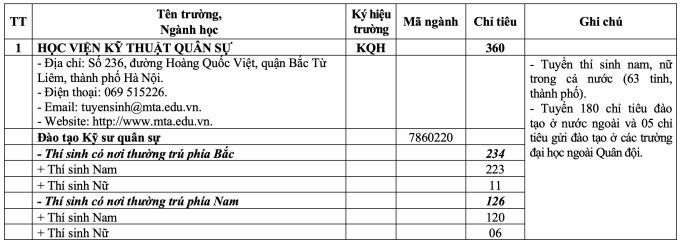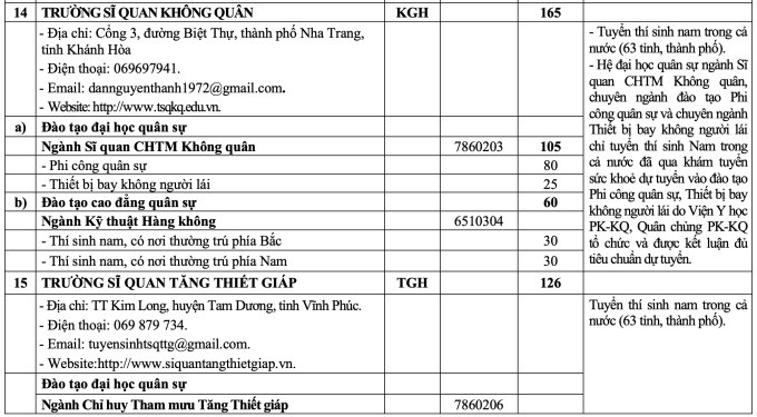 Ban Tuyển sinh quân sự, Bộ Quốc phòng vừa công bố chỉ tiêu tuyển sinh vào 20 trường khối quân đội với tổng chỉ tiêu dự kiến với hệ quân sự khoảng 4.400, chỉ tiêu hệ dân sự khoảng 3.500.
