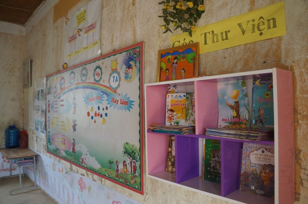Trường có hơn 500 học sinh đang theo học tại 8 điểm trường và khuôn viên trường chính ở gần trung tâm xã. Cùng cô Phạm Thu Hường – Hiệu trưởng đi tham quan cơ sở vật chất của trường, đan xen trong chúng tôi thật nhiều cảm xúc. Đó là góc “Thư viện thân thiện”, “Thư viện xanh” với đơn sơ những đầu sách, song vẫn toát lên sự chăm chút của các thầy, các cô; là khu nhà nội trú thênh thang gió với những bộ giường tầng lênh khêng, cỡ 30 con trẻ chung một phòng. Chiếc bể nước lớn gần đó, được chắt lọc từ nước mưa mát lành, là nơi tụi trẻ tự túc tắm giặt sau mỗi buổi học.