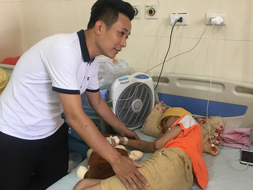 Ông Phan Anh, Giám đốc Đối ngoại Công ty Cổ phần Quốc tế VIT (nhãn hàng Evashoes) thăm hỏi động viên em Nguyễn Đăng Dương đang được truyền hóa chất điều trị bệnh u lympho không hogkin