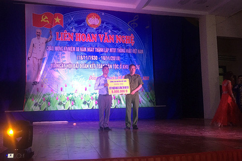 Cũng trong đêm giao lưu văn nghệ chào mừng ngày hội đại đoàn kết toàn dân tộc ở khu dân cư, Đại tá Nguyễn Hồng Ky - Trưởng Công an huyện Mỹ Đức đã trao tặng 08 suất quà cho các gia đình hội nghèo, gia đình chính sách thuộc xã Đồng Tâm và 6 triệu đồng tiền mặt quỹ vì người nghèo cho Mặt trận tổ quốc xã Đồng Tâm.