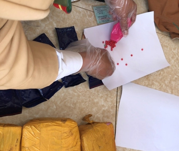 Kiểm tra hành lý, CSGT phát hiện bên trong chiếc túi có nhiều bọc nilon, bên trong có các gói nhỏ nghi là ma túy. Lập tức, đối tượng và tang vật được đưa về trụ sở Trạm CSGT Tân Lạc để làm rõ.