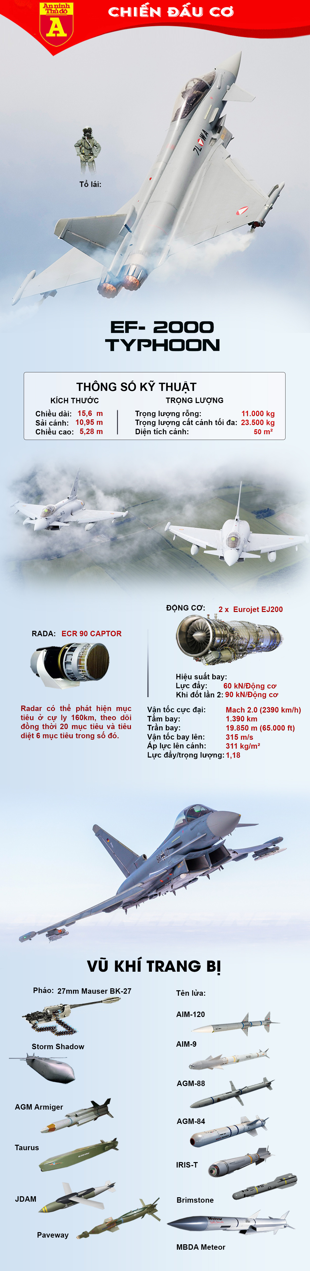 EF-2000 Typhoon là tiêm kích đa năng thế hệ 4 nổi tiếng do liên doanh Eurofighter GmbH (gồm Tập đoàn EADS của Đức – Tây Ban Nha; BAE System của Anh và Aleni Aeronautica của Italy) cùng hợp lực nghiên cứu phát triển.