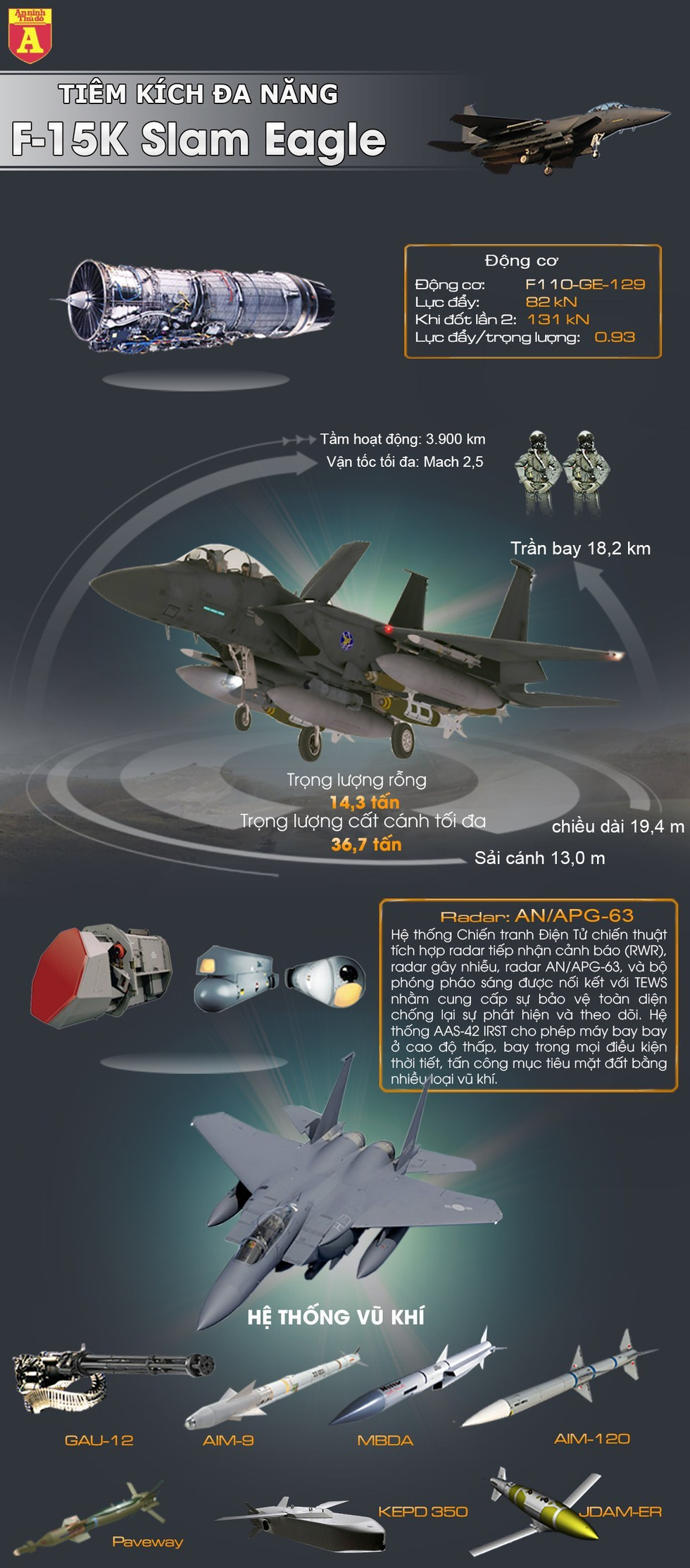 F-15K là phiên bản sửa đổi từ F-15E dành riêng cho Hàn Quốc, hiện tại không quân nước này đang sở hữu khoảng 60 chiếc tiêm kích hạng nặng đa năng này. Seoul đang có kế hoạch mua thêm khoảng 60 chiếc nữa trong tương lai. F-15K có khả năng tác chiến độc lập do được trang bị radar cực mạnh, cùng với những vũ khí có khả năng tác chiến tầm xa, F-15K có thể thực hiện các đòn tấn công tầm xa với cả mục tiêu trên không cũng như mặt đất, mặt biển trong mọi điều kiện thời tiết.