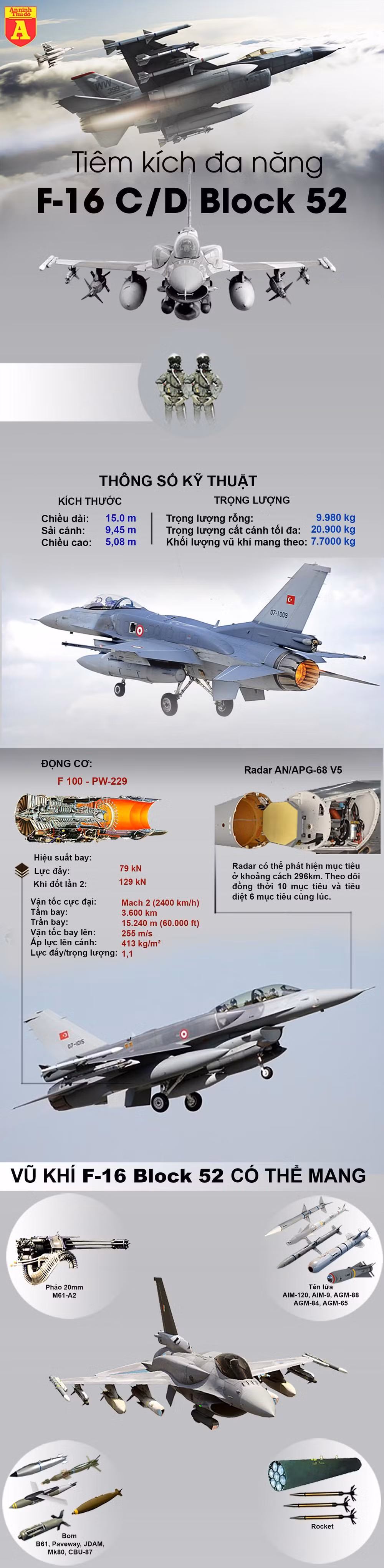 F-16C/D Block 52 Plus tích hợp luôn thùng dầu phụ 600 gallon vào thân để tăng tầm bay, trong khi vẫn bảo đảm được tính khí động học. Ngoài ra phiên bản này còn được tích hợp radar mạng pha điện tử mạnh hơn để phát hiện mục tiêu từ khoảng cách hơn 300 km, loại radar này có thể dẫn bắn và tiêu diệt chính xác mục tiêu trong mọi điều kiện thời tiết. Bên cạnh đó hệ thống tác chiến điện tử kết hợp radar tiếp nhận cảnh báo RWR và AN/ALQ-165 cho khả năng tự bảo vệ chống lại sự theo dõi của đối phương. Đây là một đặc điểm mà không nhiều máy bay làm được.