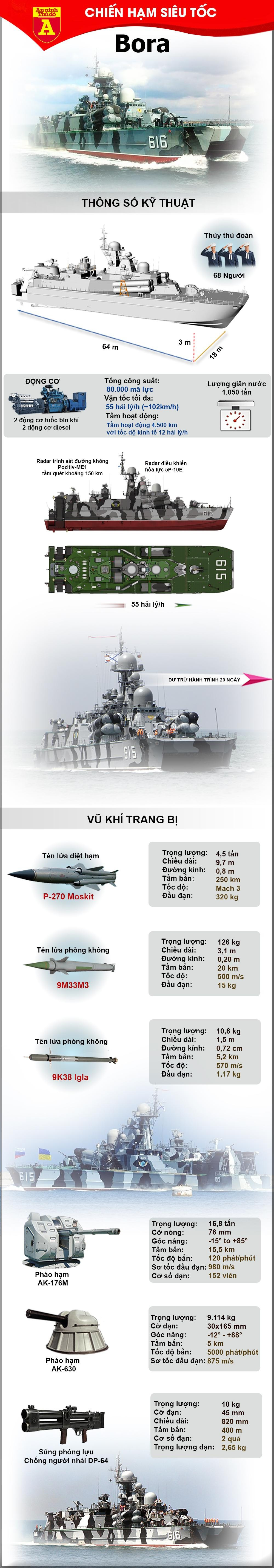 Tàu cao tốc mang tên lửa diệt hạm thuộc Dự án Project 1239 Sivuch có lượng giãn nước 1.050 tấn được coi là kho vũ khí di động trên biển của hải quân Nga. Con tàu này còn sở hữu loại tên lửa Moskit được coi là "sát thủ tàu sân bay". Đây là một trong những loại tên lửa diệt hạm khủng khiếp nhất của Nga khi có tốc độ lên tới Mach 3, rất khó trong việc đánh chặn.