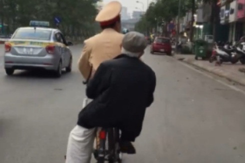 Hình ảnh rất đẹp của chiến sĩ CSGT Thủ đô, khi anh đạp xe chở cụ già về nhà (Ảnh cắt từ clip)