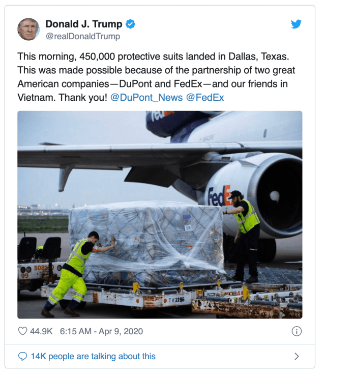 Trong khi đó, Việt Nam, mặc dù thiếu nguồn lực so với “người hàng xóm” Trung Quốc, đã tặng 550.000 khẩu trang tới Pháp, Đức, Ý, Tây Ban Nha và Anh cùng với 390.000 khẩu trang tới Campuchia và 340.000 khẩu trang tới Lào, đều là các nước láng giềng ở Đông Dương. Việt Nam cũng hỗ trợ đẩy nhanh việc giao nhận 450.000 bộ quần áo bảo hộ toàn thân của hãng DuPont sản xuất tại Việt Nam tới Mỹ. Tổng thống Donald Trump hôm 9-4 đã ngỏ lời cảm ơn “những người bạn Việt Nam của chúng ta” về tinh thần hỗ trợ đó.