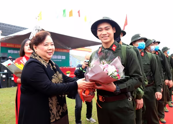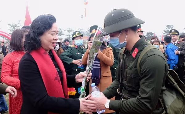 Tặng hoa động viên các tân binh huyện Đan Phượng lên đường nhập ngũ, Phó Bí thư Thành ủy - Chủ tịch HĐND thành phố Hà Nội Nguyễn Thị Bích Ngọc và lãnh đạo địa phương mong muốn mỗi tân binh nhanh chóng hòa nhập với môi trường công tác mới, tích cực học tập, rèn luyện, hoàn thành xuất sắc nhiệm vụ được giao.