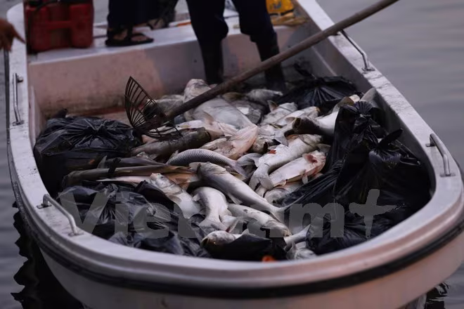 Cá chết được công nhân vớt lên để làm sạch hồ.