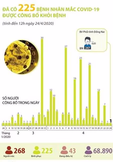Trưa 24-4, thông tin từ Tiểu Ban điều trị - Ban Chỉ đạo Quốc gia phòng chống dịch Covid-19 cho biết, trong ngày có 1 bệnh nhân điều trị tại Bệnh viện Phổi tỉnh Đồng Nai được ra viện, nâng tổng số ca được công bố khỏi bệnh tại Việt Nam lên 225 trường hợp.