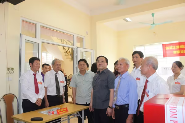 Bí thư Thành ủy Hoàng Trung Hải kiểm tra tại khu vực bỏ phiếu số 2 phường Thạch Bàn
