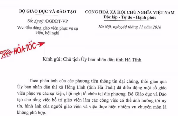 Công văn từ Bộ GD-ĐT nêu rõ, theo phán ánh của các phương tiện thông tin đại chúng, thời gian qua, Ủy ban nhân dân thị xã Hồng Lĩnh (tỉnh Hà Tĩnh) đã điều động một số giáo viên phục vụ các sự kiện, hội nghị tổ chức tại địa phương. Bộ Giáo dục và Đào tạo cho rằng việc bố trí giáo viên làm các công việc có thể ảnh hưởng tới uy tín, hình ảnh của người giáo viên và việc thực hiện nhiệm vụ chuyên môn là không phù hợp.