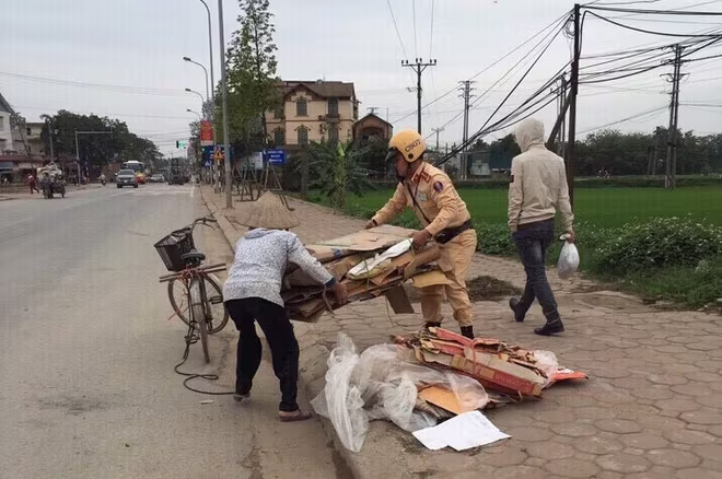 Trong khi tuần tra kiểm soát, Trung úy Đỗ Văn Tuyên, cán bộ Đội CSGT CAH Thạch Thất giúp đỡ người dân gặp nạn giữa đường