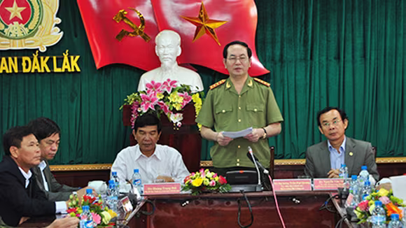 Đại tướng Trần Đại Quang, Ủy viên Bộ Chính trị, Trưởng ban chỉ đạo Tây Nguyên, Bộ trưởng Bộ Công an phát biểu chỉ đạo tại Công an tỉnh Đắk Lắk