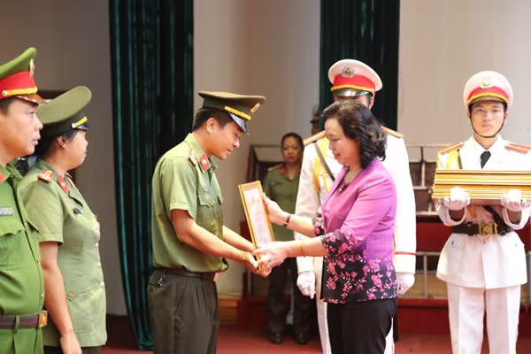 Bà Ngô Thị Thanh Hằng, Ủy viên Trung ương Đảng, Phó Bí thư thường trực Thành ủy Hà Nội trao bằng khen của UBND TP cho các tập thể và cá nhân có thành tích xuất sắc trong công tác đấu tranh phòng chống tội phạm, bảo vệ bầu cử