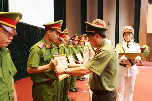 Thiếu tướng Đoàn Duy Khương tặng Giấy khen của Giám đốc CATP cho các tập thể và cá nhân có thành tích xuất sắc trong khám phá các vụ án lớn trên địa bàn thành phố