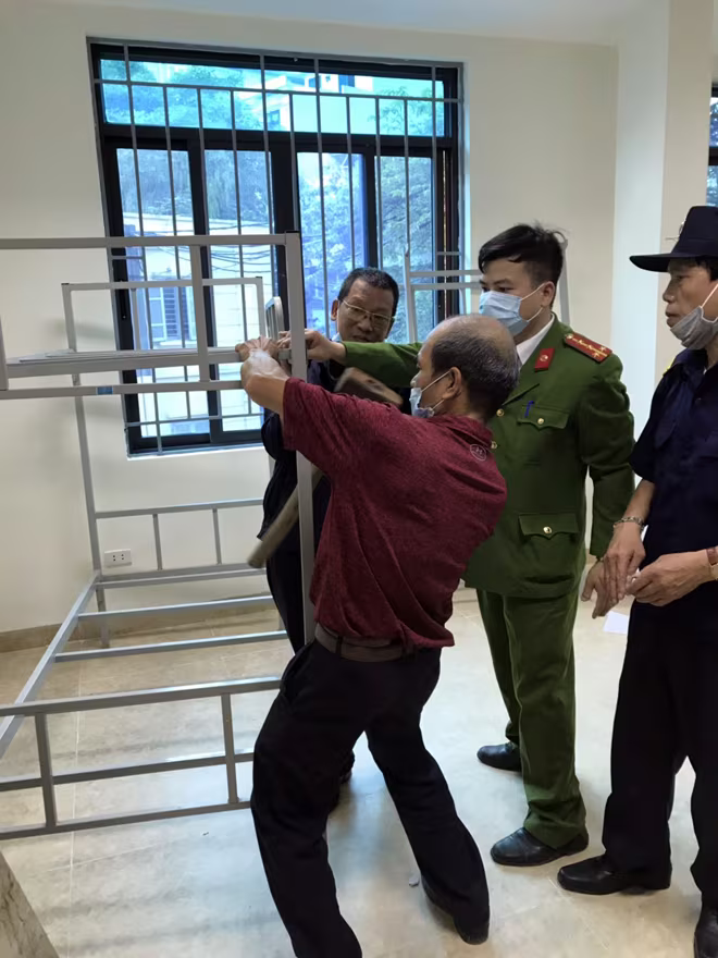Lực lượng chức năng lắp giường dã chiến tại trụ sở UBND phường Trúc Bạch