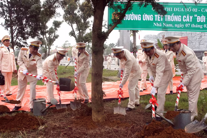 Đồng chí Phó Giám đốc CATP - Đại tá Nguyễn Thanh Tùng cùng chỉ huy các đơn vị trong Cụm thi đua số 2 trồng cây lưu niệm tại Khu lưu niệm Sáu điều Chủ tịch Hồ Chí Minh dạy CAND (xã Nhã Nam, huyện Tân Yên, tỉnh Bắc Giang)