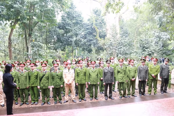 Cán bộ chiến sỹ CAH Quốc Oai lắng nghe cán bộ khu di tích giới thiệu về nơi ở, làm việc của Bác Hồ kính yêu