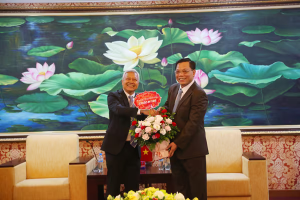 Ngài Ibnu Hadi - Đại sứ Đặc mệnh toàn quyền Cộng hòa Indonesia tặng hoa chúc mừng Thiếu tướng Nguyễn Hải Trung, Giám đốc CATP Hà Nội