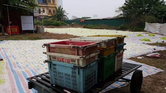 Tại thời điểm kiểm tra, có rất nhiều nguyên liệu làm mứt, xe đẩy, thùng đựng nước vôi ngâm bí, trên sân là bí, đu đủ nguyên liệu đang phơi dở, chỉ cách mặt đất bởi một lớp bạt. Theo người dân bên cạnh, thấy đoàn kiểm tra, chủ sân nguyên liệu trên đã bỏ đi.