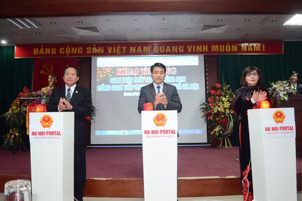 Từ trái qua: Thứ trưởng Bộ TT&TT Trương Minh Tuấn, Chủ tịch UBND TP Nguyễn Đức Chung và Giám đốc Sở TT&TT Hà Nội Phan Lan Tú, nhấn nút khai trương giao diện tiếng Anh của Cổng Giao tiếp điện tử Hà Nội
