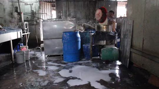 Máy móc dụng cụ dùng để sản xuất hủ tiếu cáu bẩn, nhếch nhác mất vệ sinh còn nhân viên thì dùng tay trần, không hề có bảo hộ lao động