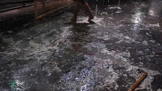 Bên trong cơ sở, rác rưởi và nước thải đọng đầy sàn nhà. Các nhân viên cởi trần, không dùng bất cứ dụng cụ bảo hộ nào trong quá trình chế biến. Các vật dụng, máy móc của cơ sở cũng hết sức thiếu vệ sinh.