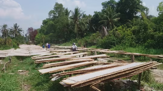 Bên ngoài cơ sở, đoàn kiểm tra phát hiện hàng trăm liếp tre đang phơi hủ tiếu thành phẩm dọc đường đất, bên cạnh các cống nước đen sì, rác thải bốc mùi hôi thối. Các liếp tre phơi hủ tiếu được gác và che chắn sơ sài, thậm chí rơi xuống sát mặt đất.