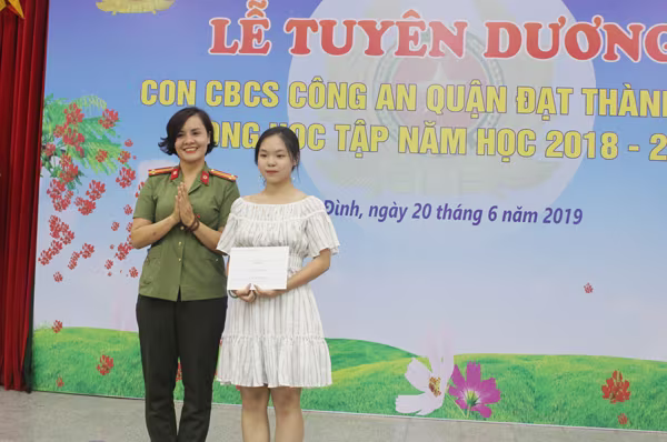 Trung tá Lương Thị Thanh Huyền, Phó Chủ tịch Hội phụ nữ CATP Hà Nội trao khen thưởng cho cháu Bùi Hương Ly có thành tích trong kỳ thi học sinh giỏi cấp quốc gia
