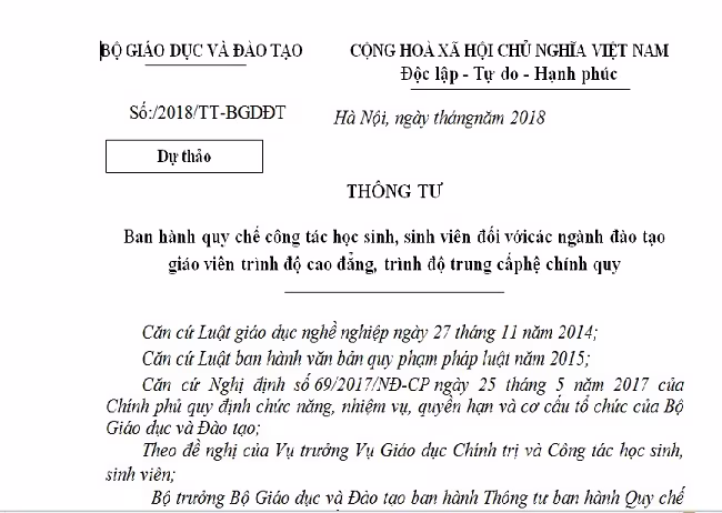 Dự thảo Thông tư Quy chế công tác học sinh, sinh viên đối với các ngành đào tạo giáo viên trình độ cao đẳng, trình độ trung cấp hệ chính quy đang được Bộ GD-ĐT lấy ý kiến góp ý đến hết ngày 26/11.