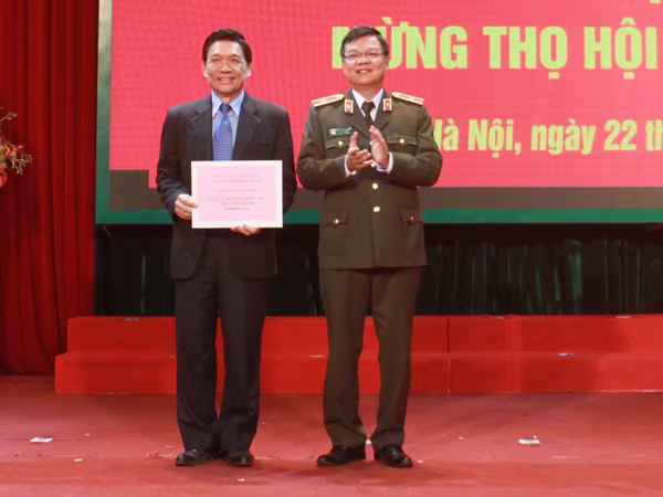 Thiếu tướng Đào Thanh Hải, Phó Giám đốc CATP tặng quà, chúc mừng đồng chí Nguyễn Đức Nghi - đại diện CLB sỹ quan hưu trí Công an Hà Nội