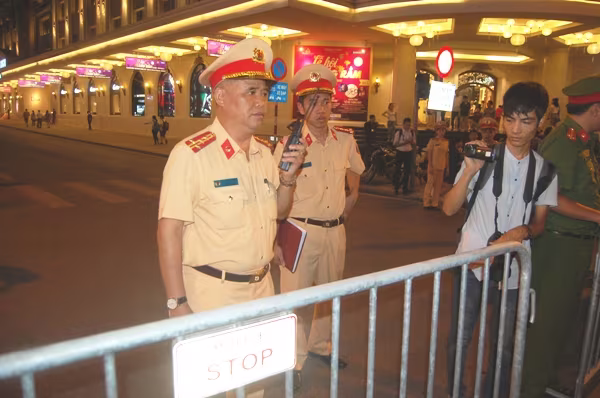 Đại tá Đào Vịnh Thắng, Trưởng Phòng CSGT có mặt tại các chốt làm nhiệm vụ khá sớm, đi từng chốt động viên từng CBCS thêm quyết tâm đảm bảo tuyệt đối ANTT, TTATGT phục vụ người dân đi lại xung quanh khu vực đi bộ hồ Hoàn Kiếm cũng như các tuyến phố lân cận.